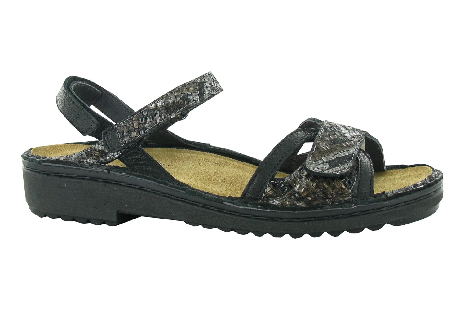 The Aeres sandal has a strappy cutout design offered in unique multi colored leathers. This style has three hook and loop straps for complete adjustability. Naot’s removable, anatomic cork and latex footbed is wrapped in pampering suede and molds to the foot with wear.