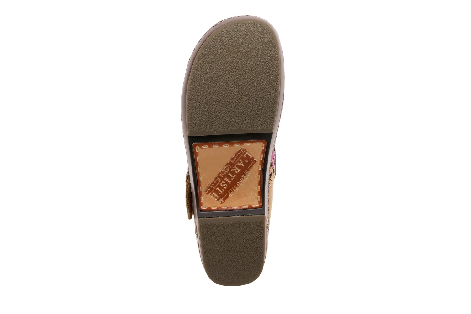 Stylish French-inspired open-back leather clog with an adjustable strap featuring hand-painted, laser-cut, and etched floral design to bring beautiful style all on our signature comfort sole.