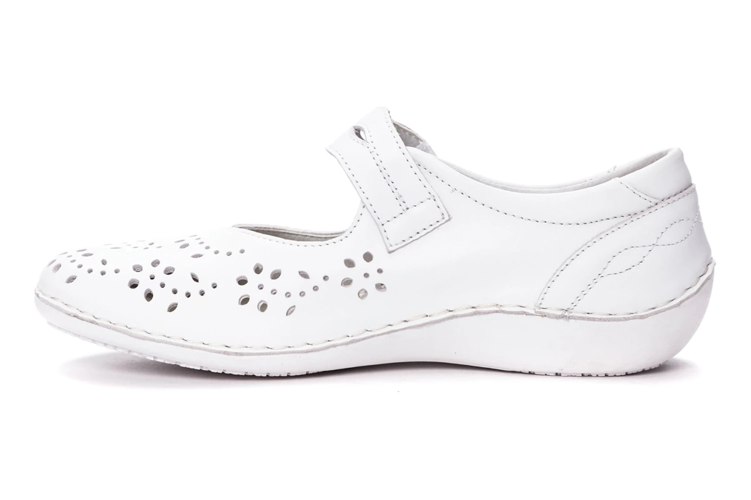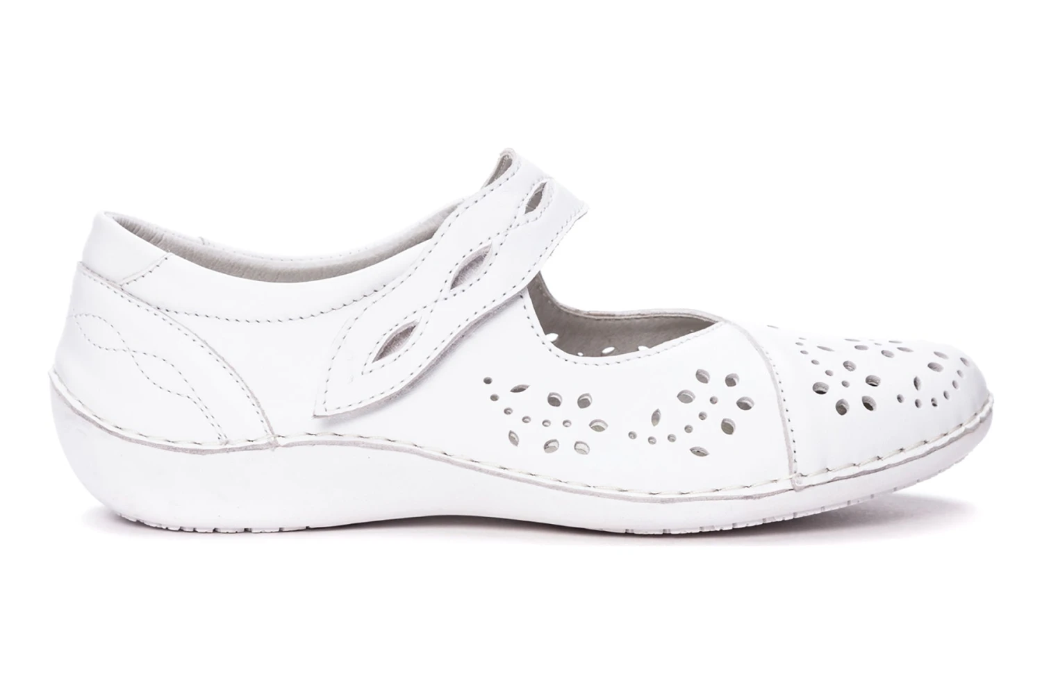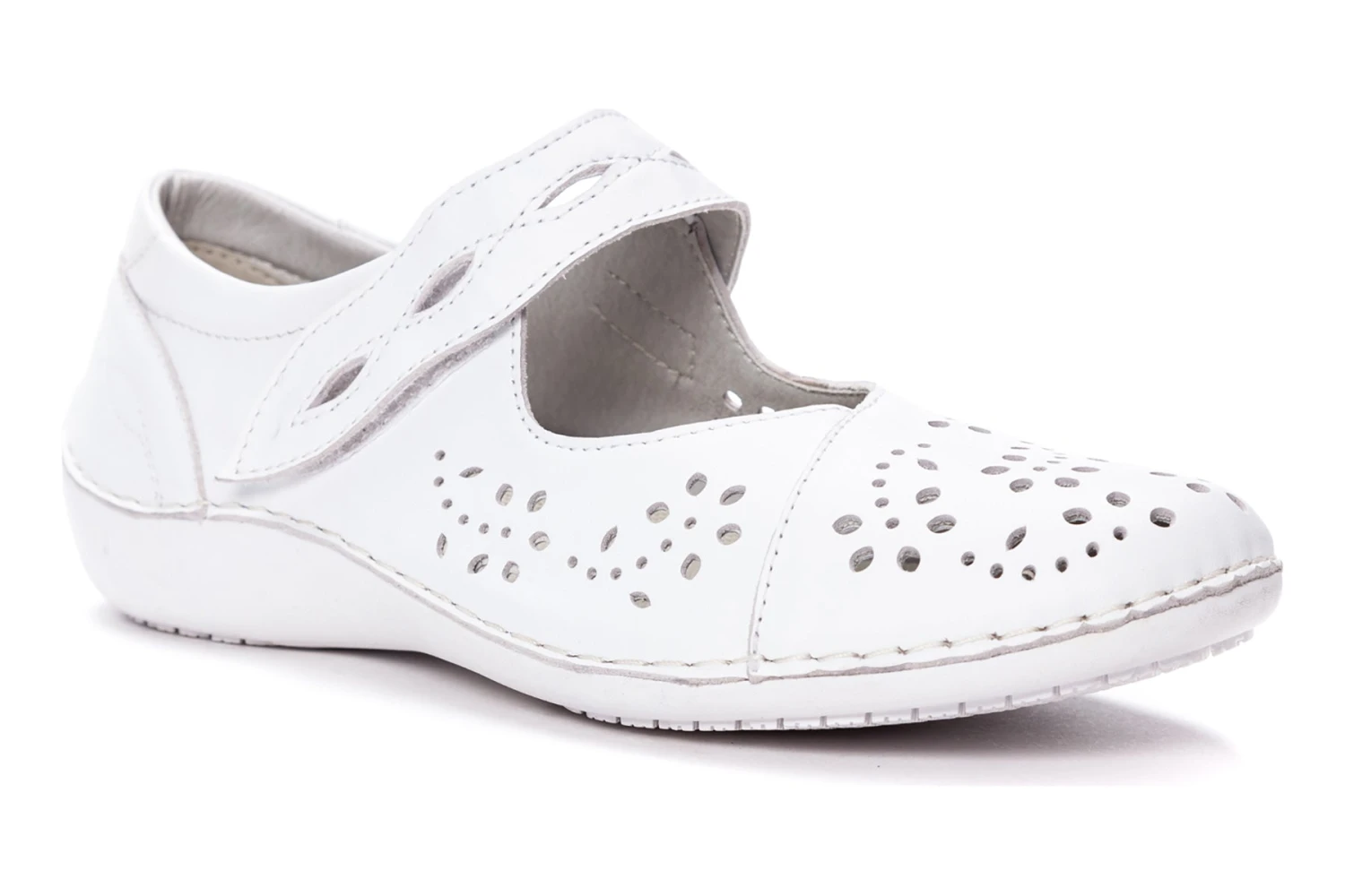 Full grain leather mary jane with hook and loop strap closure. Arch supporting high density open cell PU foam allows air to flow for a cooler, healthier footbed. Flexible and light rubber outsole gives extra grip on all surfaces.