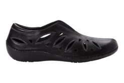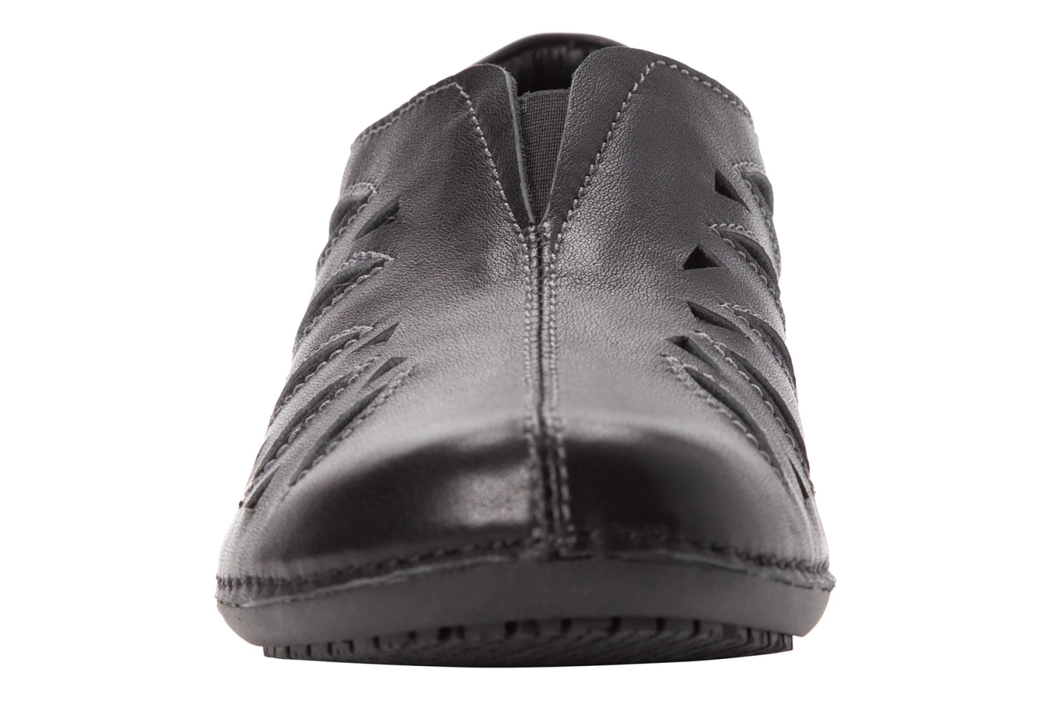 Full grain leather slip-on with cutouts for breathable comfort. Great arch supporting with a high density open cell PU foam allows air to flow for a cooler, healthier footbed. Flexible and light rubber outsole gives extra grip on all surfaces.