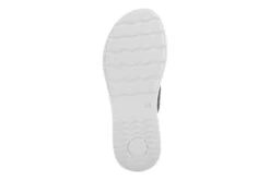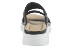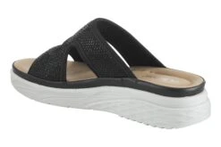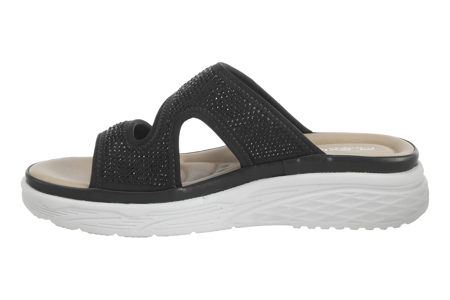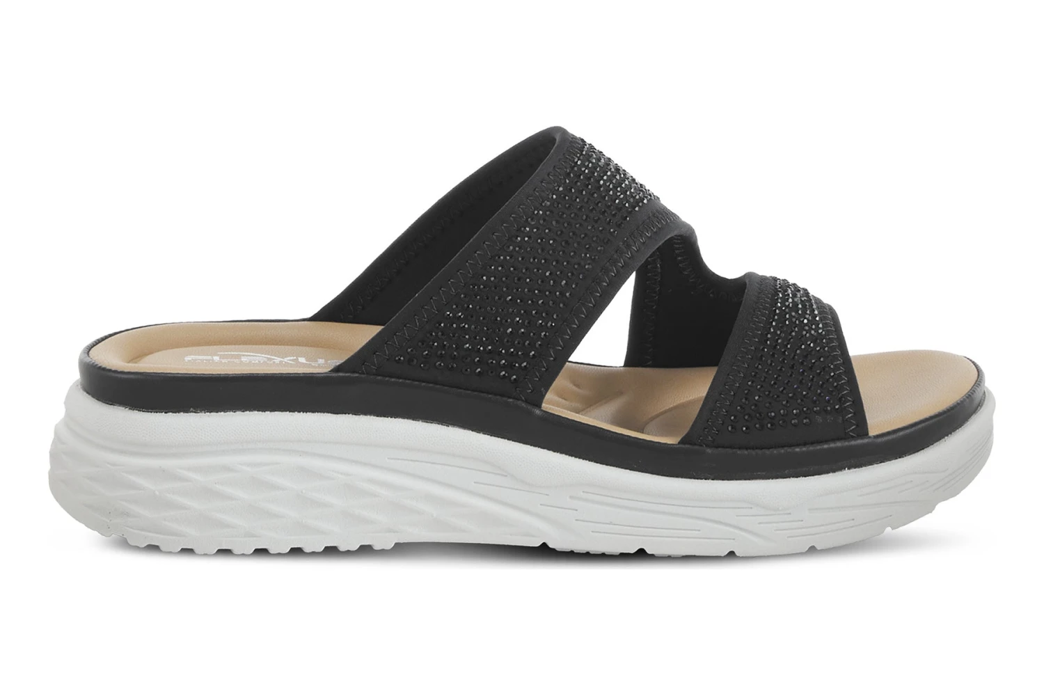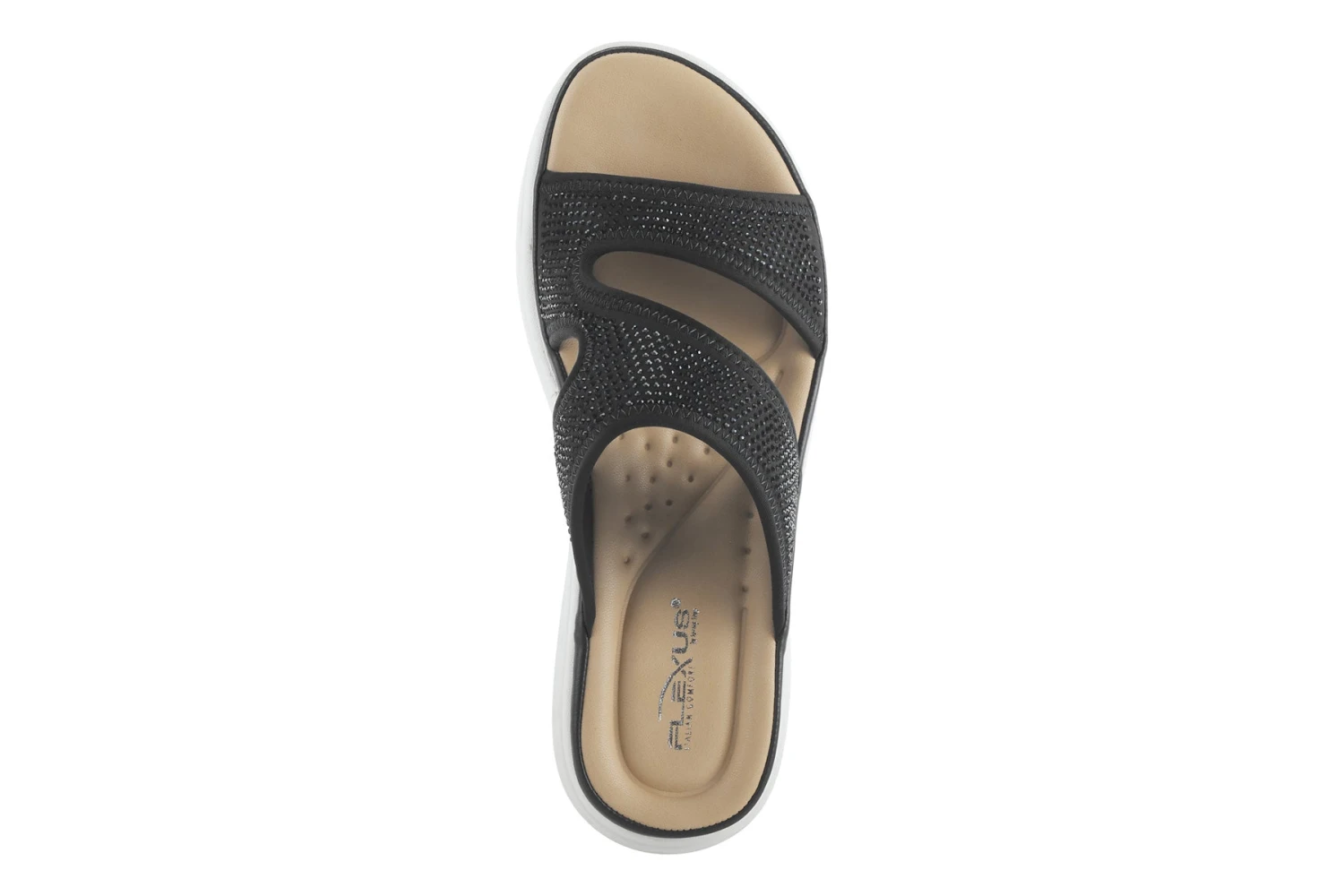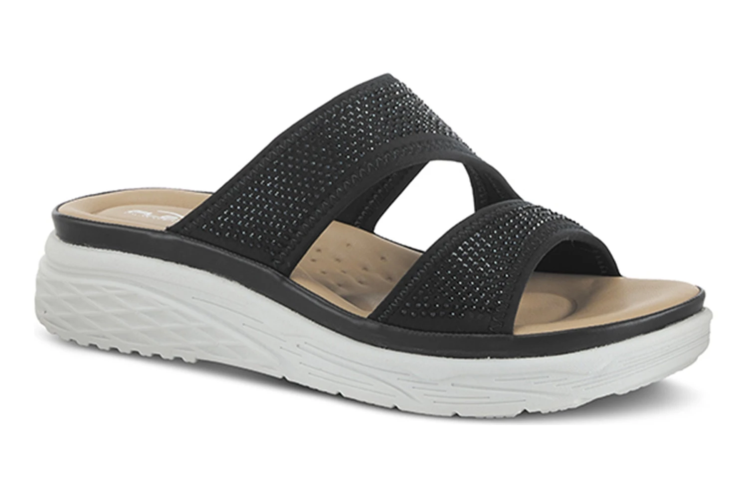 Sporty slip-on sandal with asymmetrical lycra upper decorated by rhinestones on a cushy insole and flexible, slip-proof, chunky, flatform outsole.