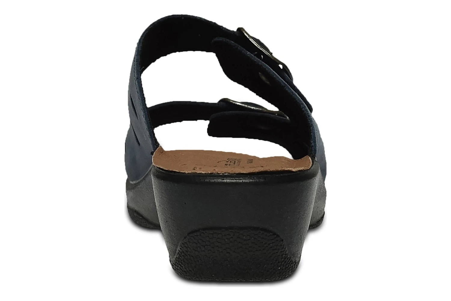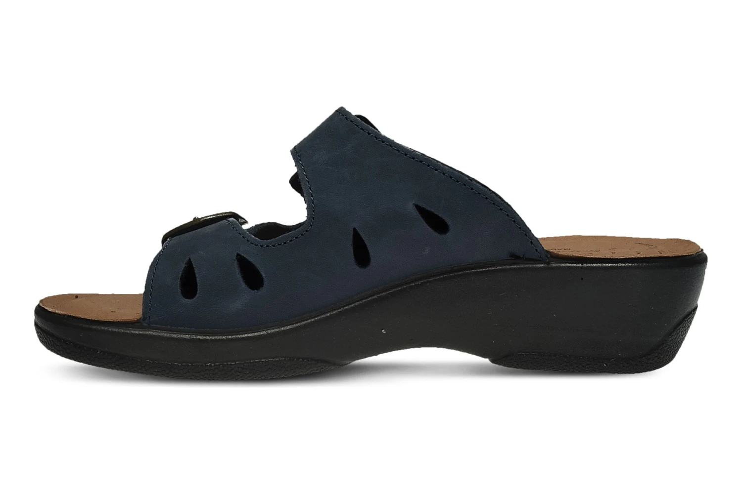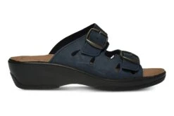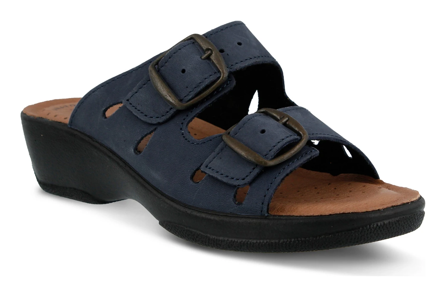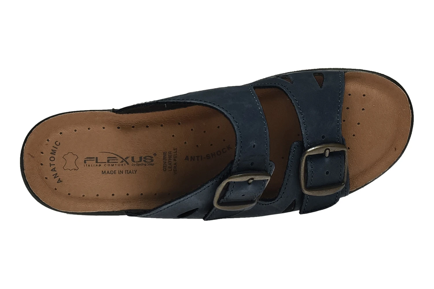 Italian-made, slide leather sandals fashioned with metal buckles.