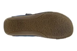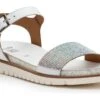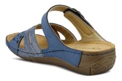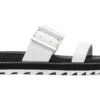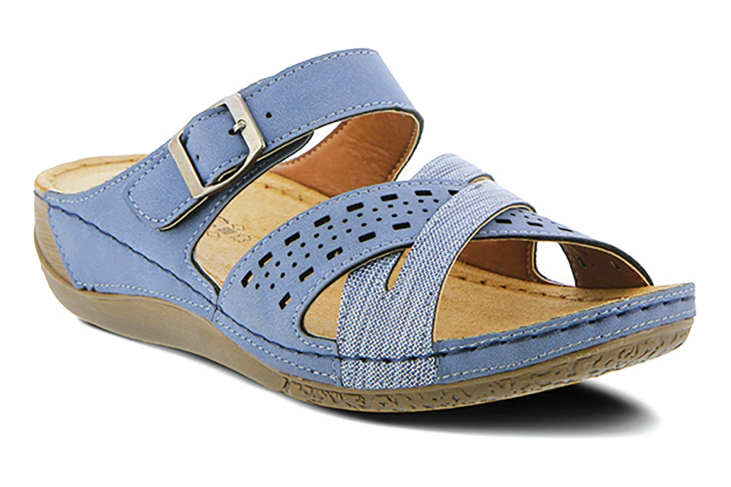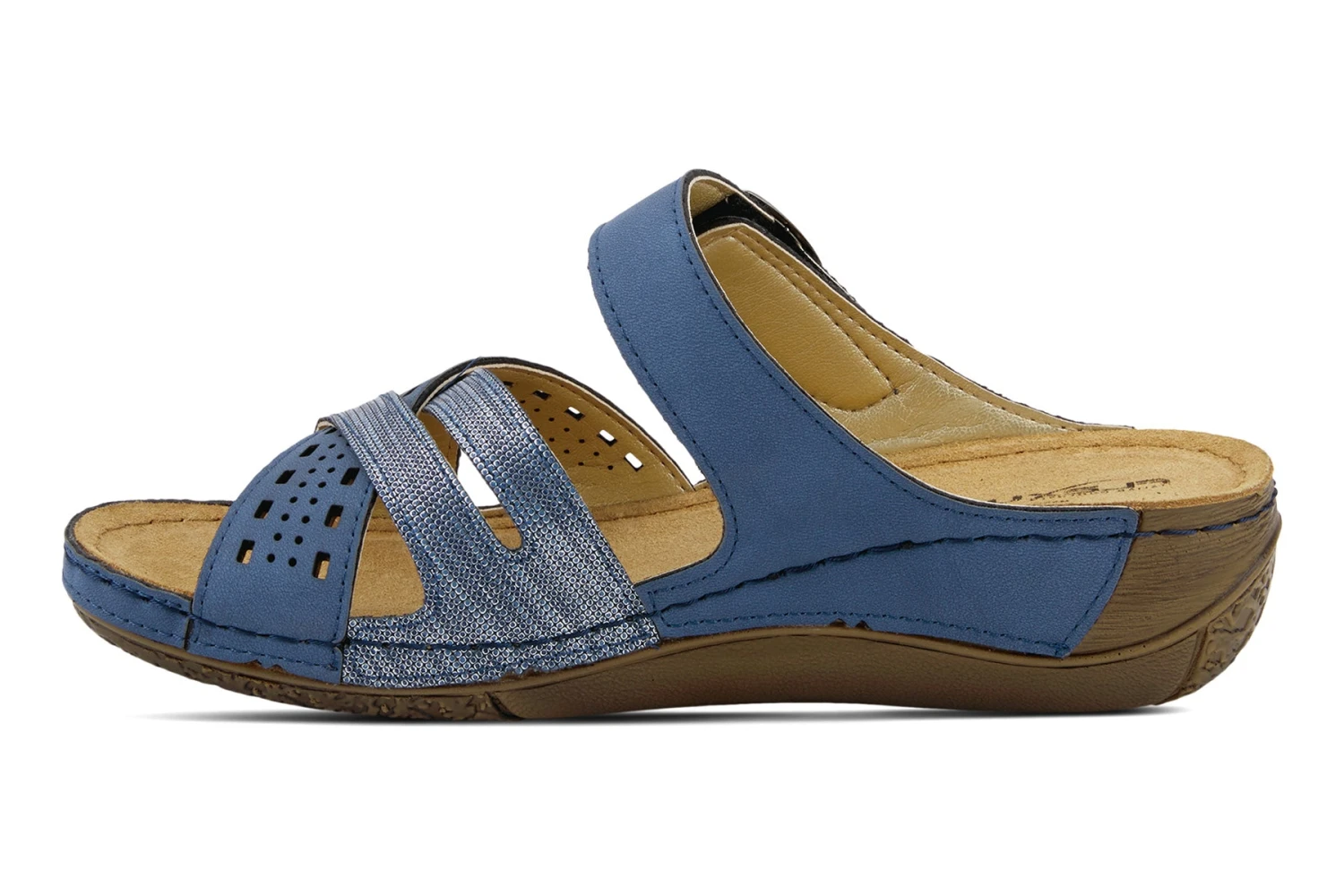 Two tone and textured slide with adjustable hook & loop fastening and shiny metal buckle detail, featuring cross over straps with cut outs, all on a polyurethane wedge outsole with heavy stitch detail.