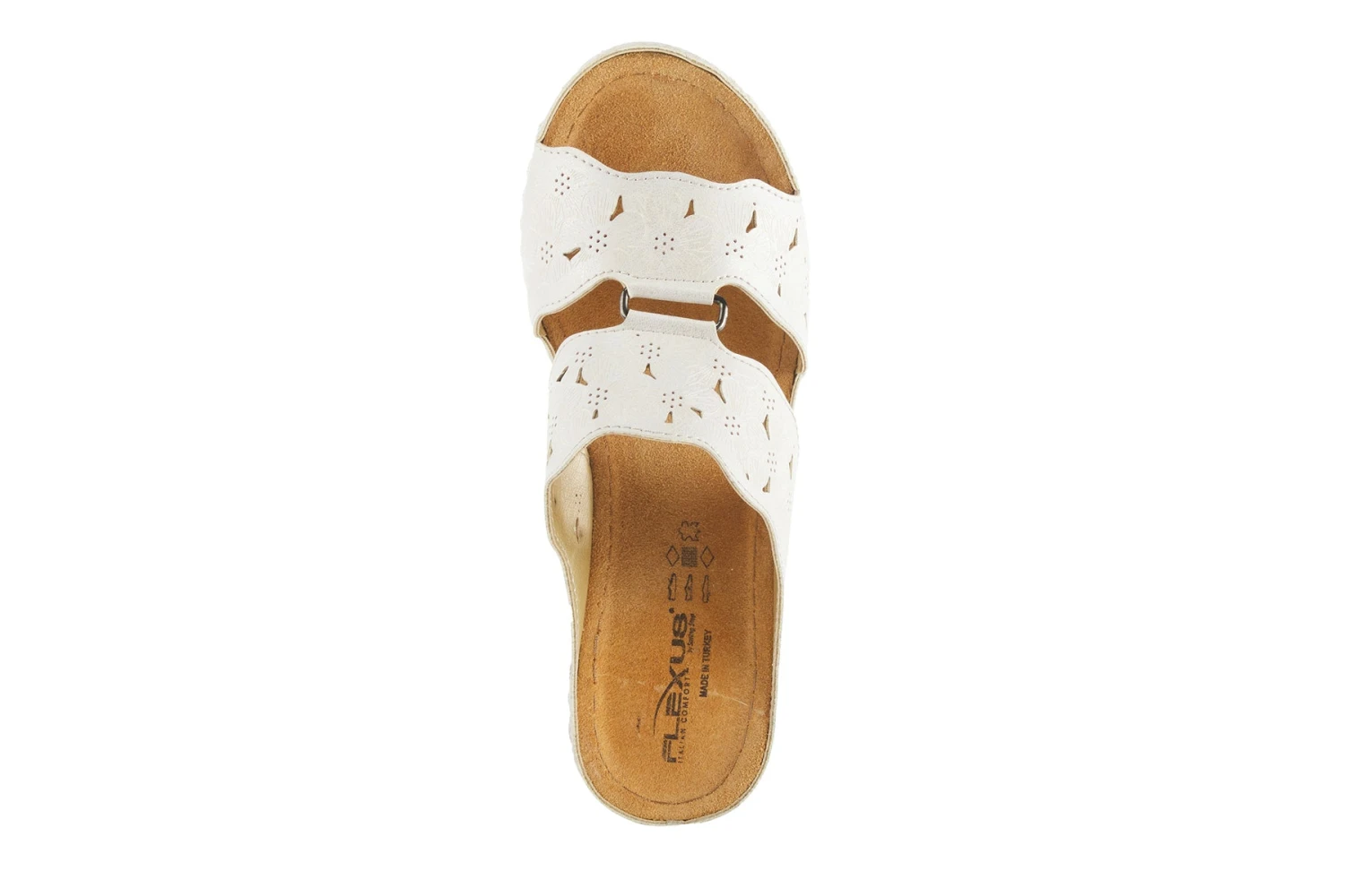 Double strapped wedge slide sandal with a connecting loop and geometric perforations