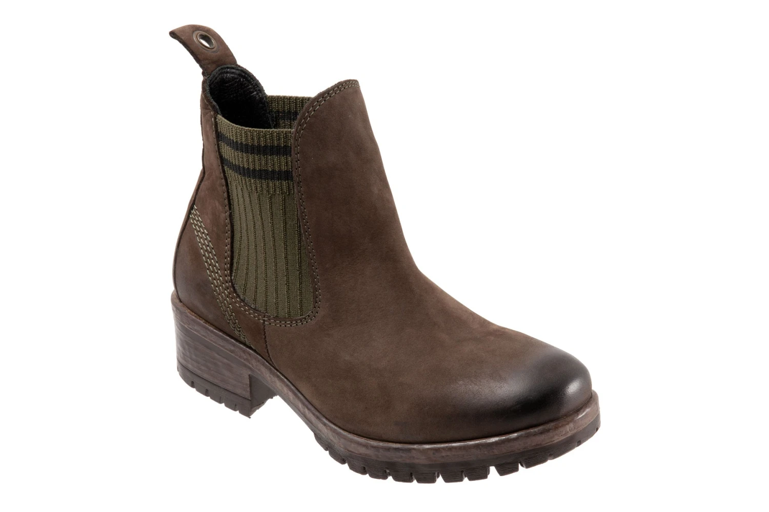 A toothy lug sole and chunky heel, lend a touch of rugged utility to a classic chelsea boot, styled with contrast goring insets and an elongated pull tab.