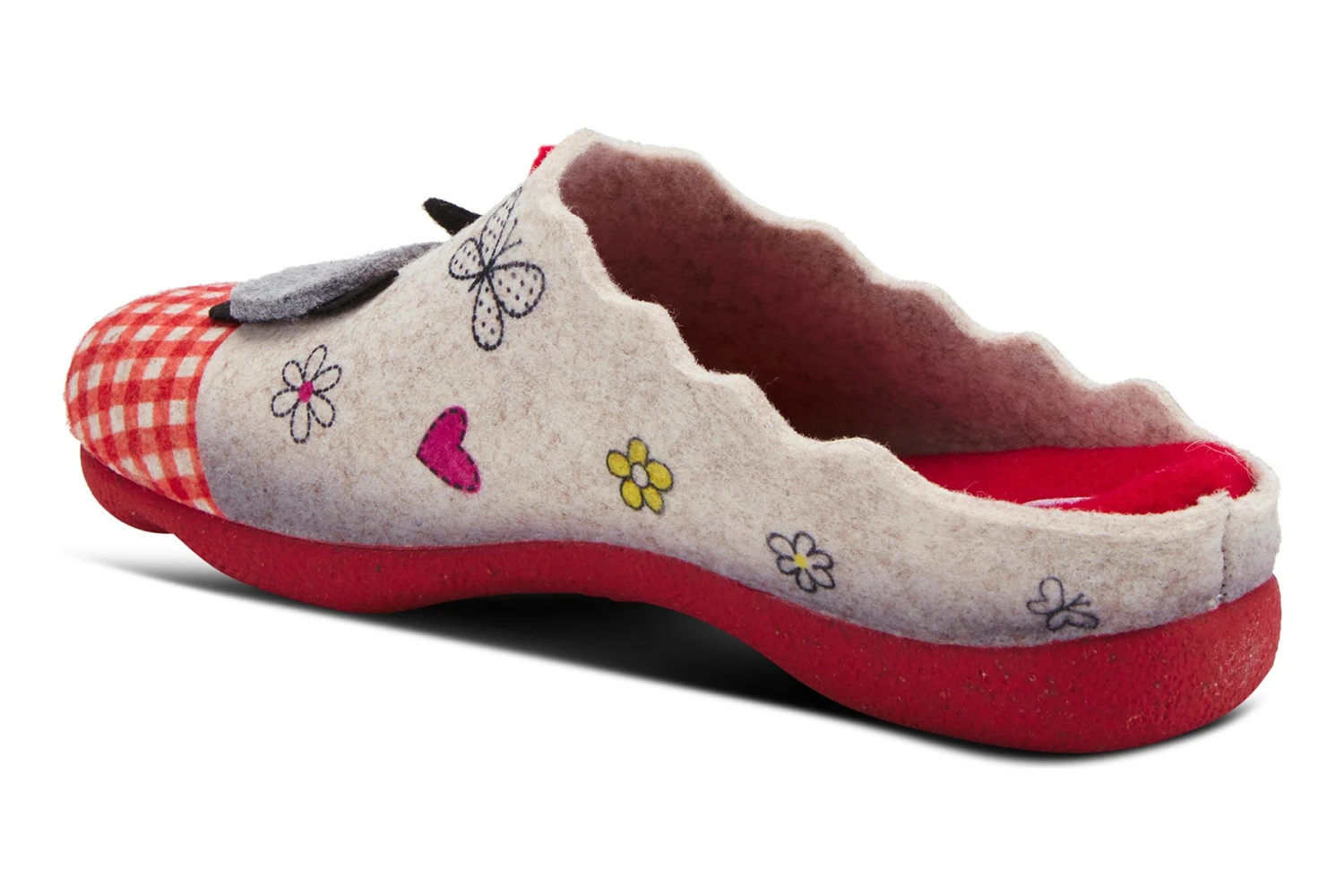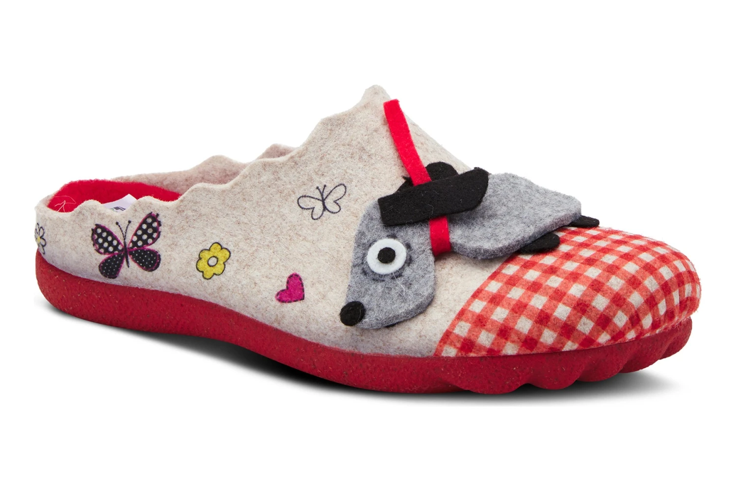 Easy to Slip-on indoor/outdoor wool slipper featuring a vibrant applique design ‘dog on a leash’ on the vamp and cheerful butterflies, flowers, hearts, and gingham cap toe on a contoured sole with the natural arch and indentation of a real foot and toes.