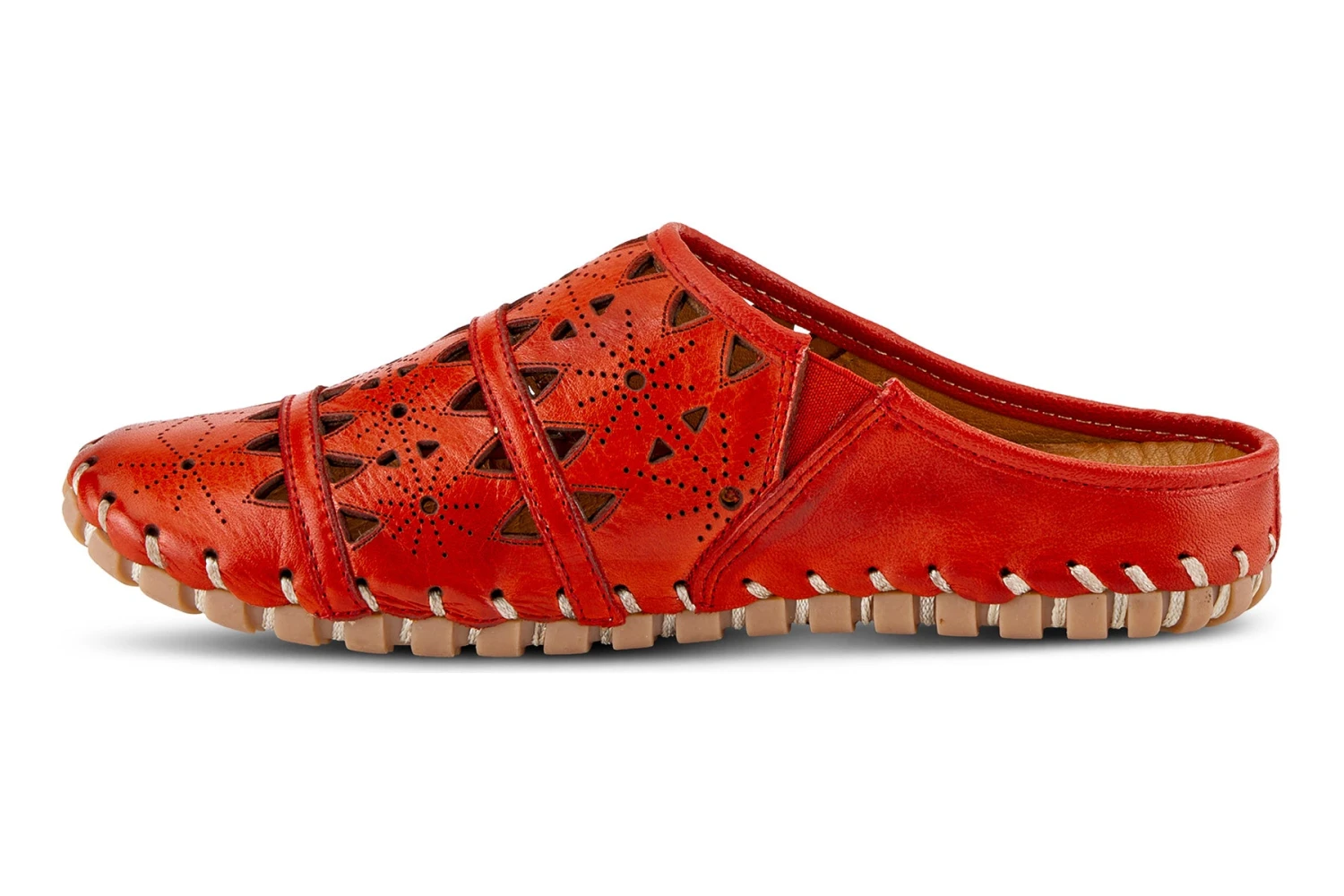 European-influenced, leather open-back slip-on shoe, featuring geometric laser cutouts and etching for a unique modern appeal all on a lightweight, durable, flexible, rubber sole for all-day comfort.