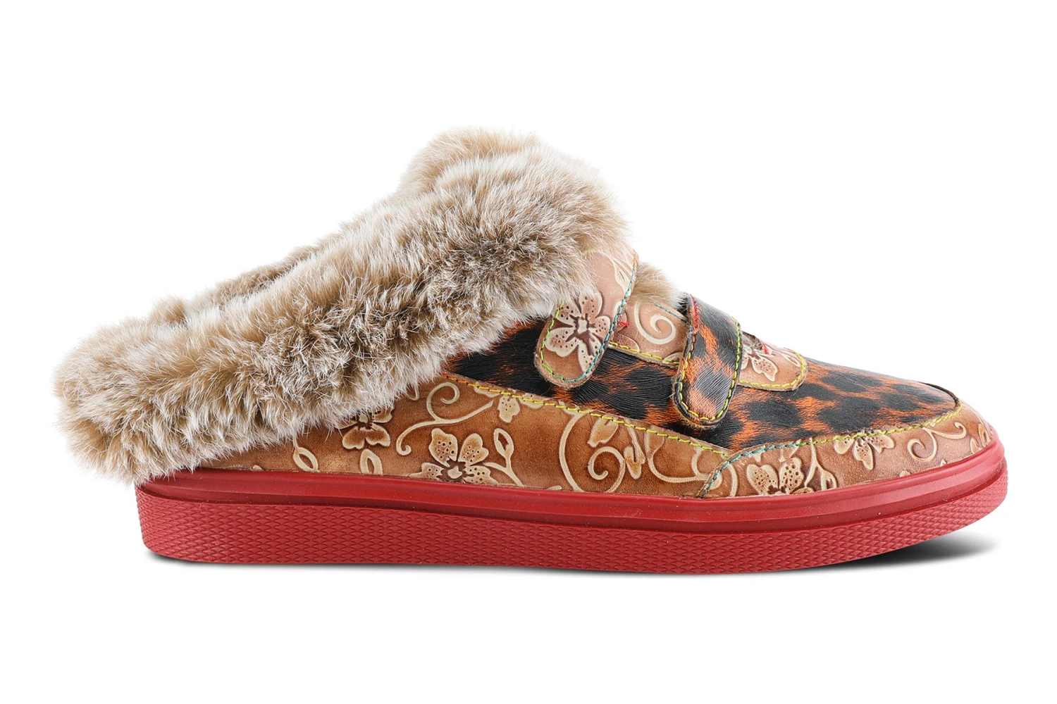 L`Artiste Style: LAMYA -Indoor/outdoor slipper featuring an animal print trimmed in an embossed floral print and plush faux-fur with cozy lining on a flexible, comfortable sole.