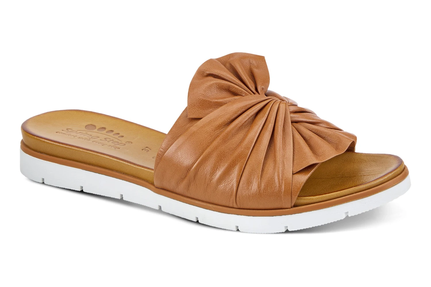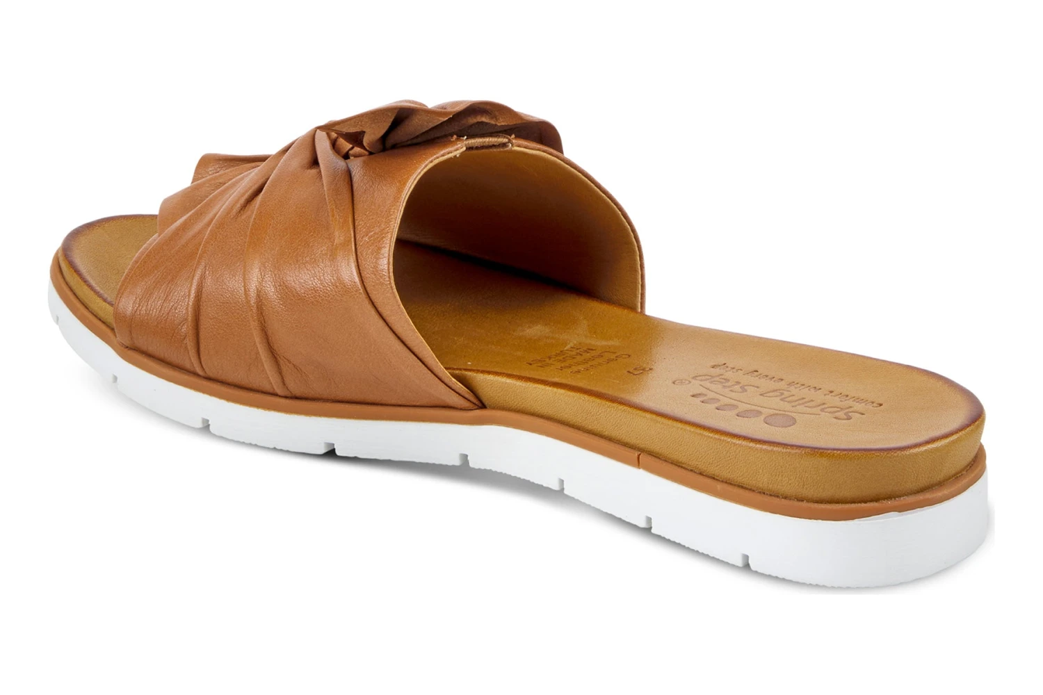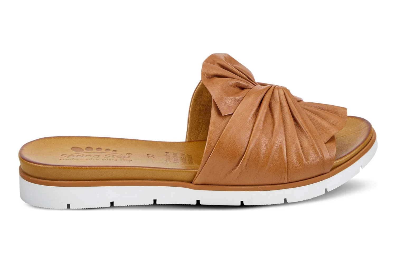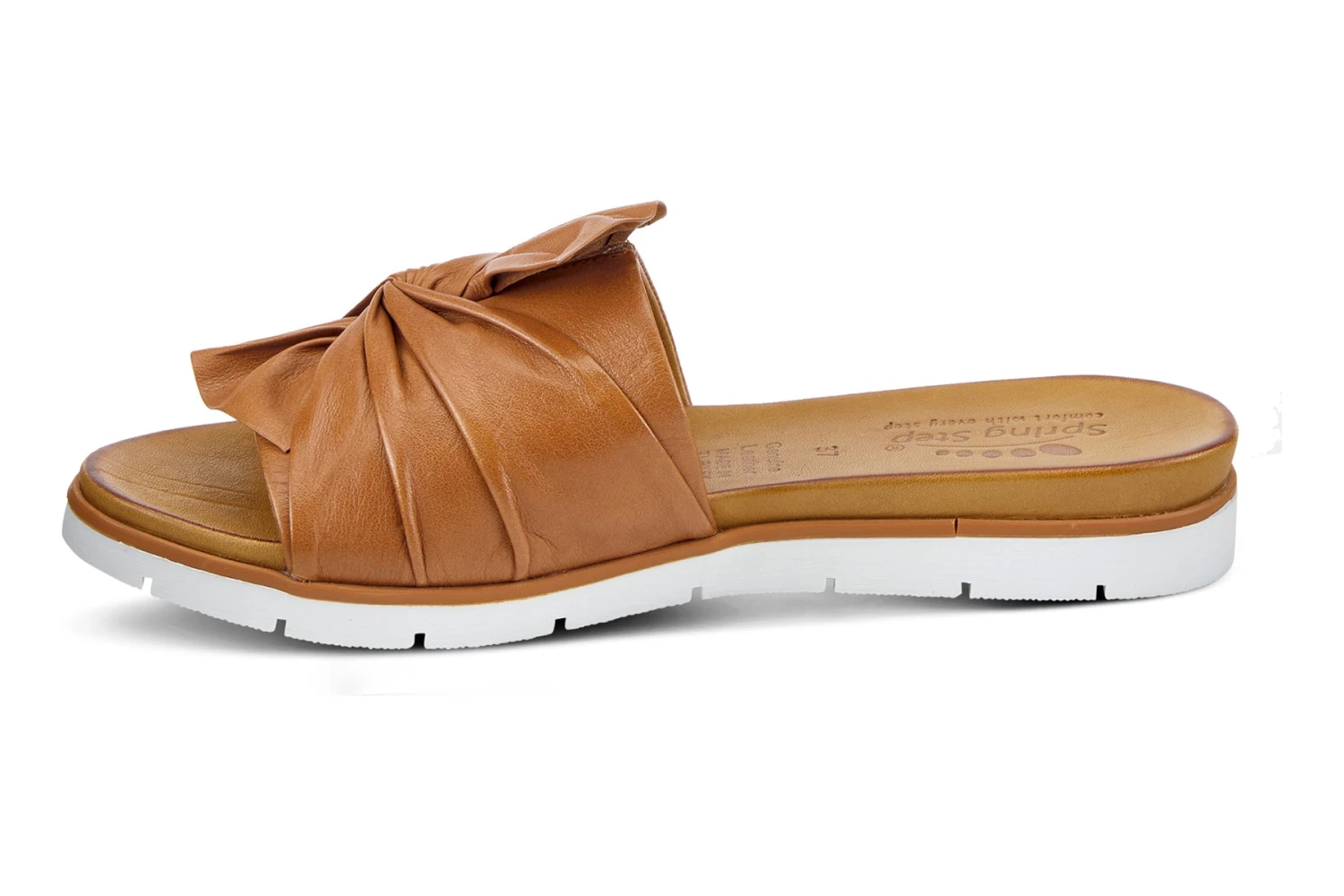 Flexible outsole, slip-on style with a beautiful leather twist bow. In a rainbow of colors, this is your go-to slide for the season. Small V-gore underneath the bow for additional adjustability. All parts of the foot touches the leather.
