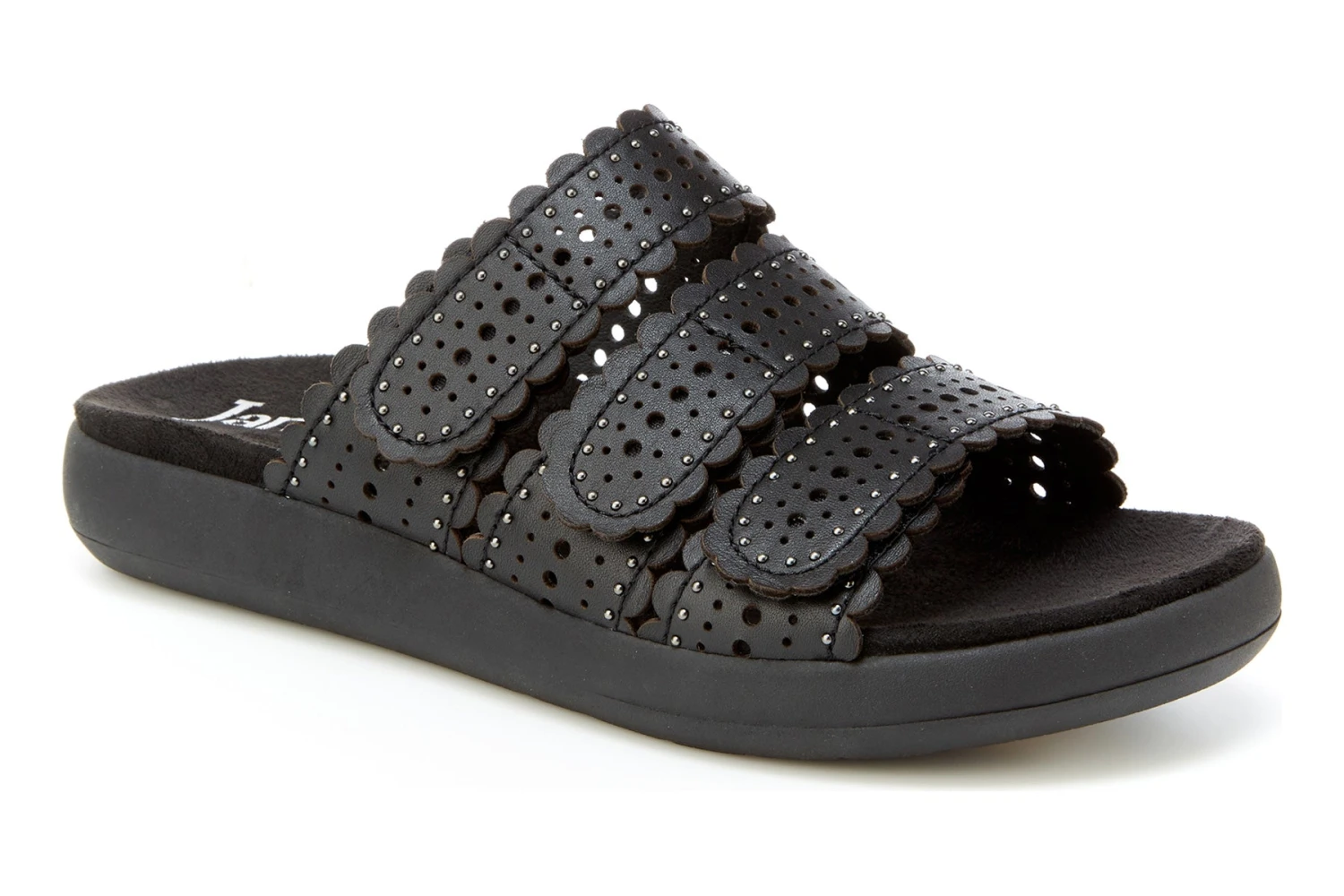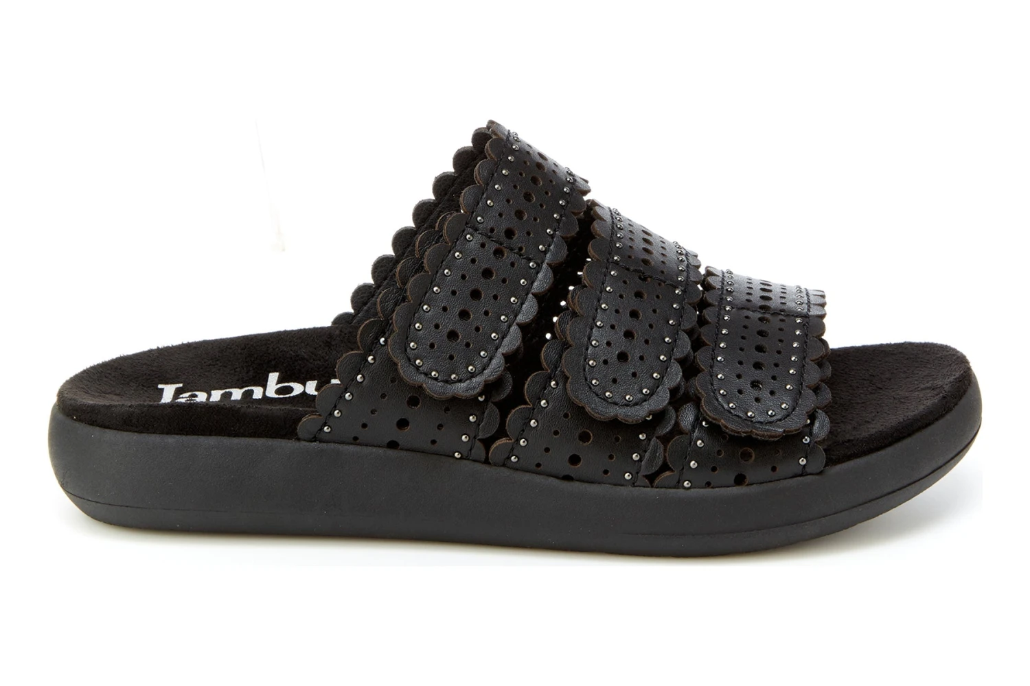 Jambu Odysseus is a chic strappy sandal. These warm weather shoes have leather uppers, adjustable straps, memory foam insoles and a durable rubber outsole. Micro studding and perforated details adorn the upper, while a slip-on construction offers breathability and stability.
