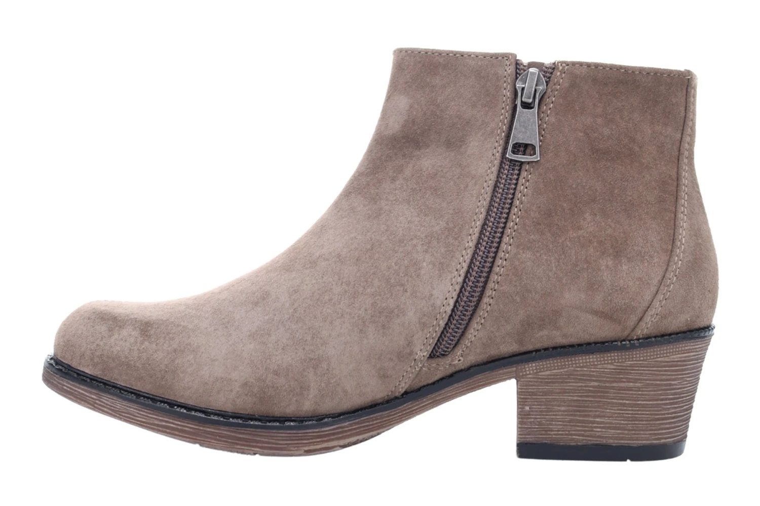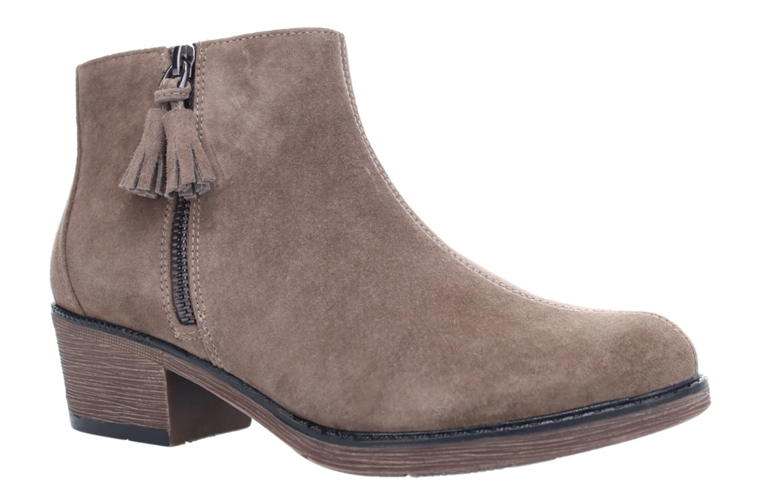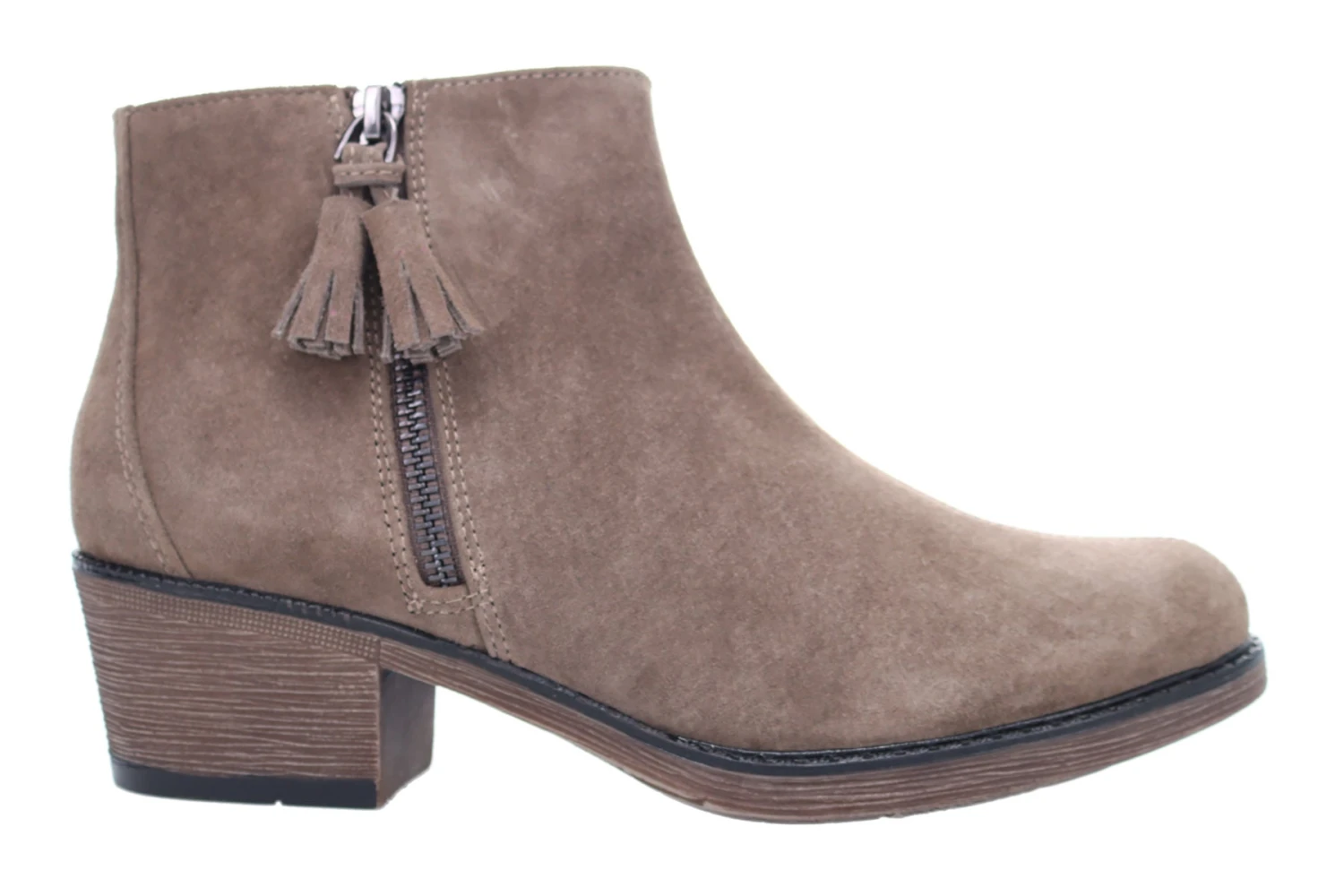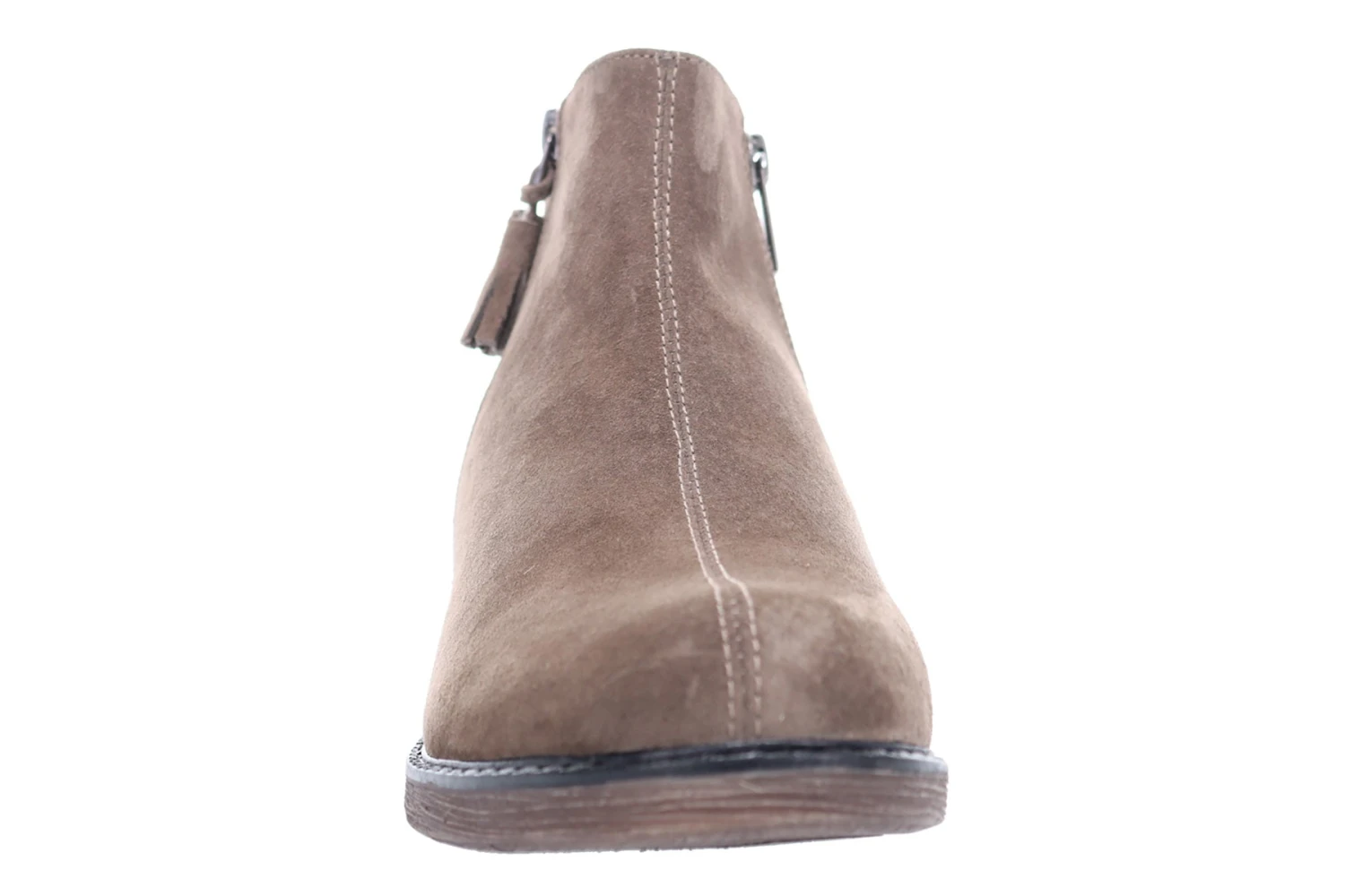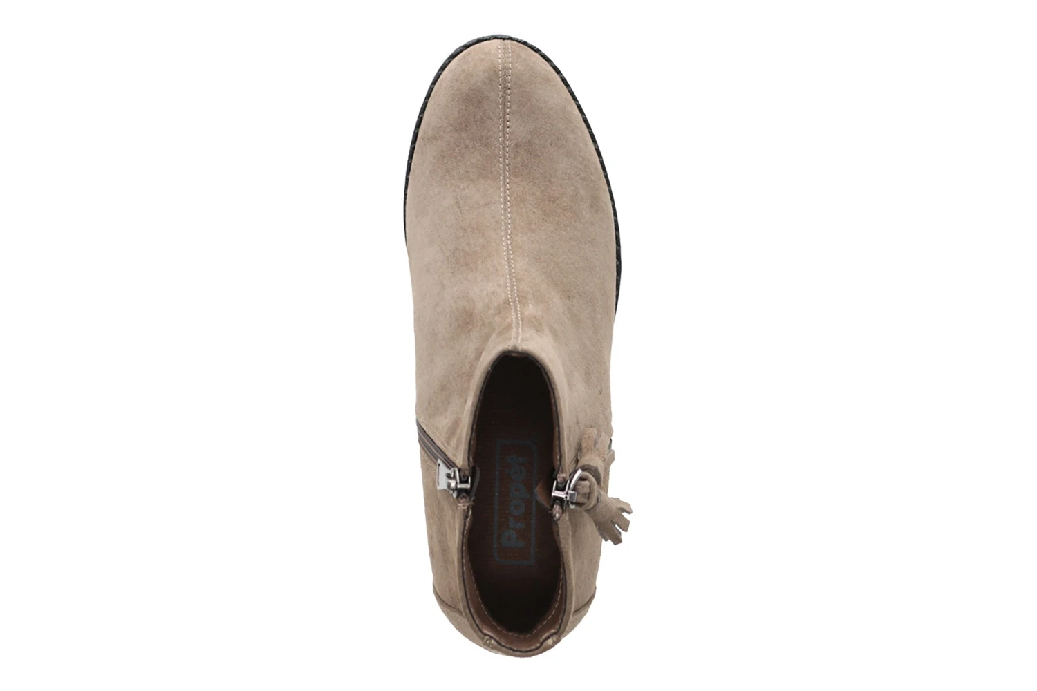 - Full pig suede upper with inside zip and decorative tassel.