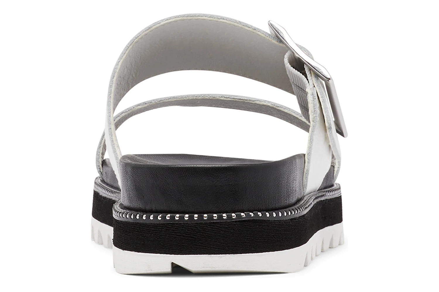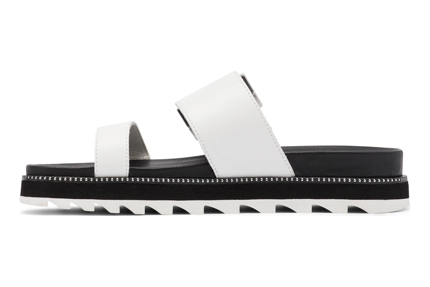 A twist on a classic slide for an edgy and effortless look. Beautiful full grain leather straps. Buckle detail with hidden gore for adjustability. Studded welt.